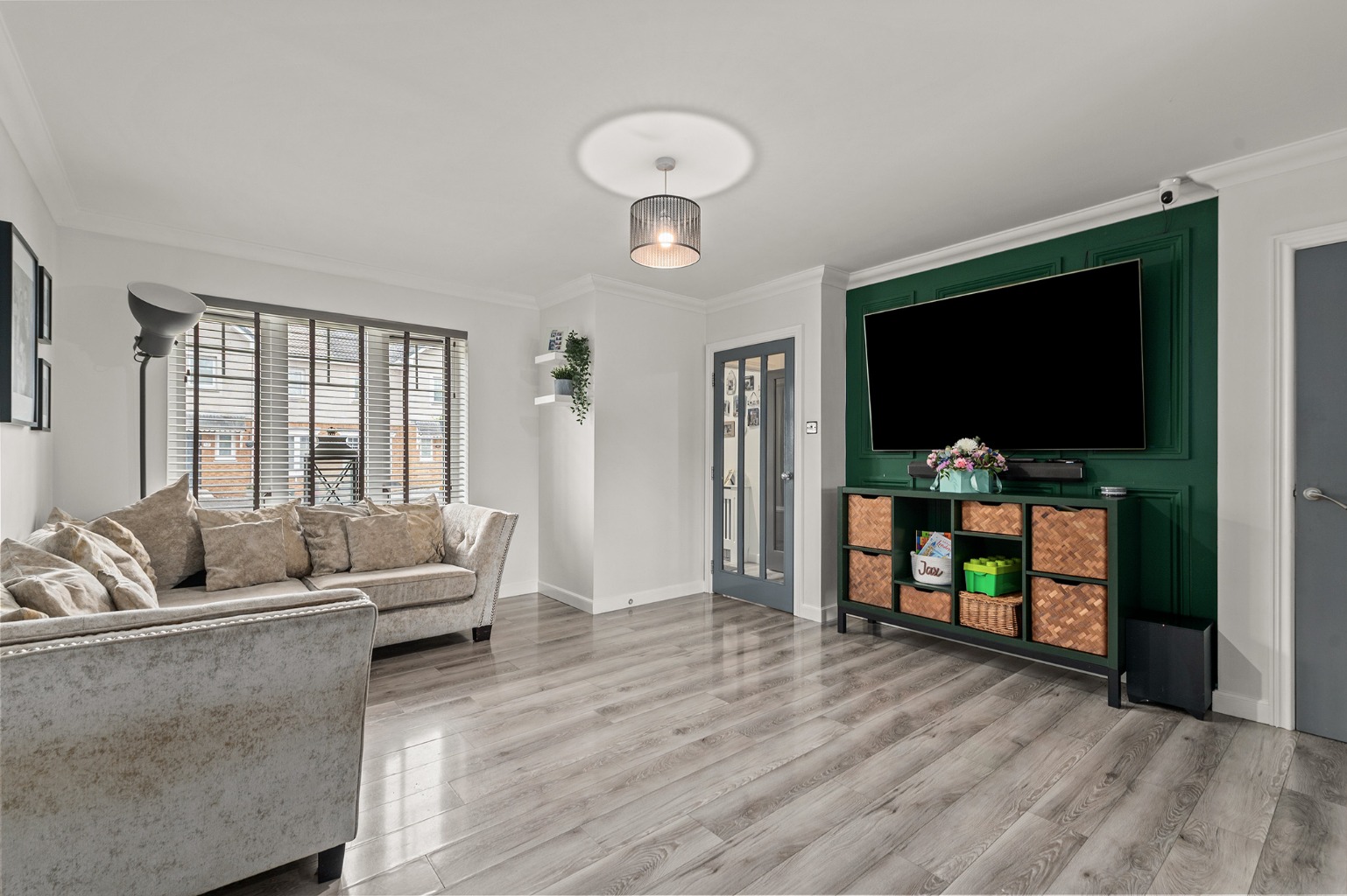 The property boasts a contemporary, open-plan kitchen/diner, truly the hub of this family home. Fitted with a range of modern wall and base units with ample worktop space, it caters to all culinary needs. The dining area seamlessly connects to the kitchen, creating an ideal space for everyday meals and entertaining. French doors from the dining area open directly onto the south-east facing rear garden, extending the living space outdoors and allowing for effortless indoor-outdoor flow during warmer months.